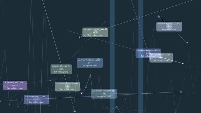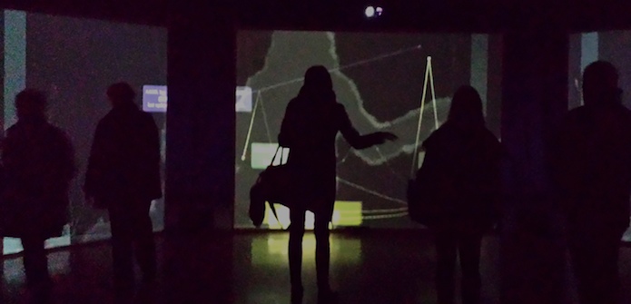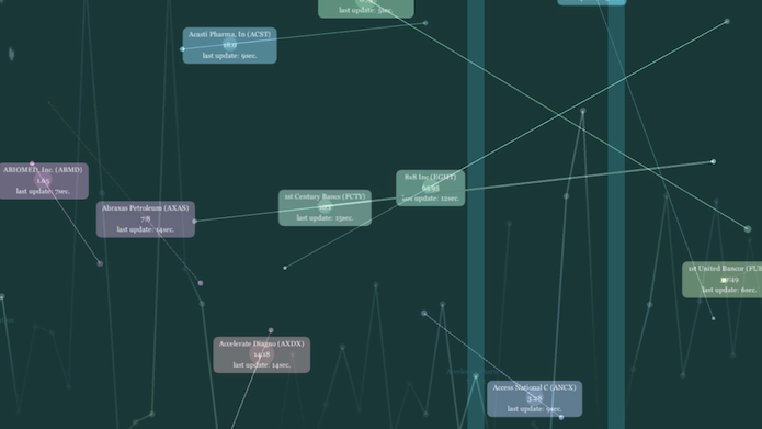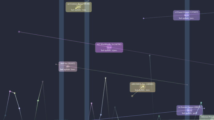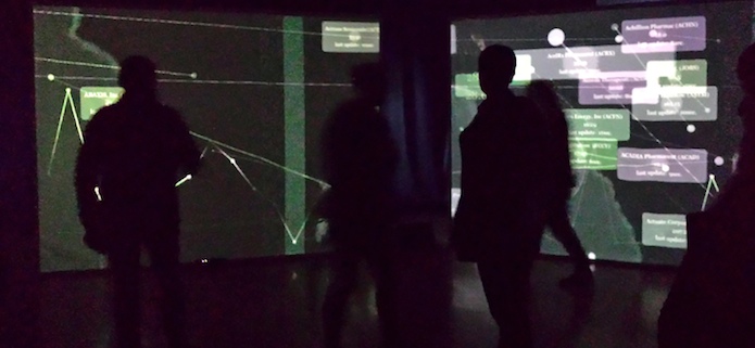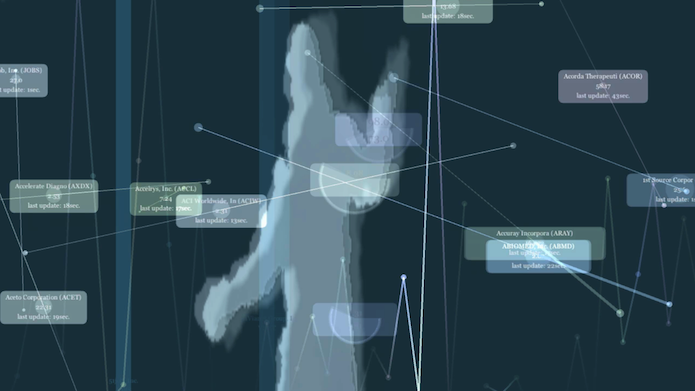 Aleastock is an interactive, sound-oriented work driven by (captured in real time) companies trading on the stock exchange (NASDAQ). Ca. 2700 companies most important for the global economy was selected as data sources for the installation. Interacting with the installation is possible in two ways. Firstly, by motion tracking system to detect the position and gestures of the audience. Second, mobile devices (such as tablets and smartphones) that can communicate with the installation and allow selecting listed companies and a number of other manipulations. In the Aleastock is important in particular the impact of the rules of economics on the visual and sound form of work. Thus, the installation is sonificating, and visualizing instantaneous state of the world economy. Aleastock is literally shaped by the work of the global flow of capital and moves the issues typically presented in the arts in a metaphorical way onto the plane literalism. The visual and sound form of the Aleastock also reflects the muddling and infantile nature of publicly available information on the state of the world economy. Relevant information usually are misrepresenting or hidden from the public - only the strong subsidence and subsequent collapse of the system are somehow distributed as a public available information (although they are so strongly, that it is impossible to continue hiding them). And experience in contact with Aleastock clash of the situations described above. Musical concept of the installation is also inspired by the idea of controlled aleatorism, co-developed and applied several times in musical compositions by Polish composer Witold Lutoslawski. The premiere of the work took place during the Field of Vision – Field of Hearing / Lutoslawski Festival at Centre of Contemporary Art "Znaki Czasu" (Toruń / Poland), Nov 15-17 2013.