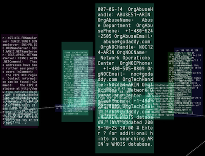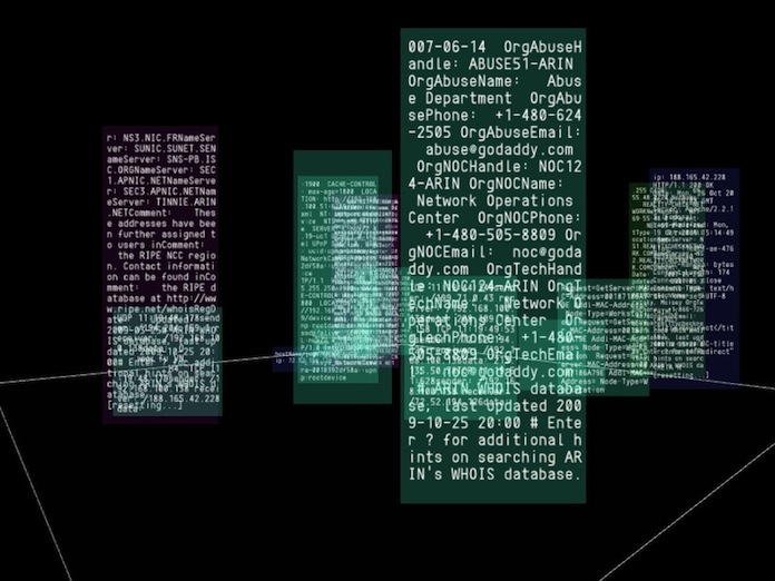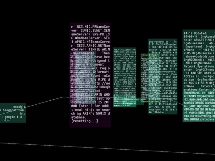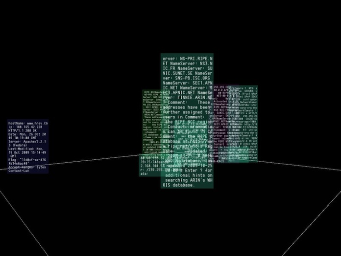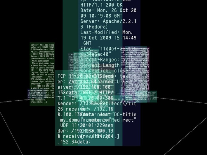 Net Eater is a series of interactive/generative environments based on data captured from communication networks (traffic) and transforms it into a variety of audiovisual forms. Net Eater is concentred on abstract, statistic interpretation of the data flow, rather than semantic correlations. In other words: dataflow are describing the structures of scanned networks.