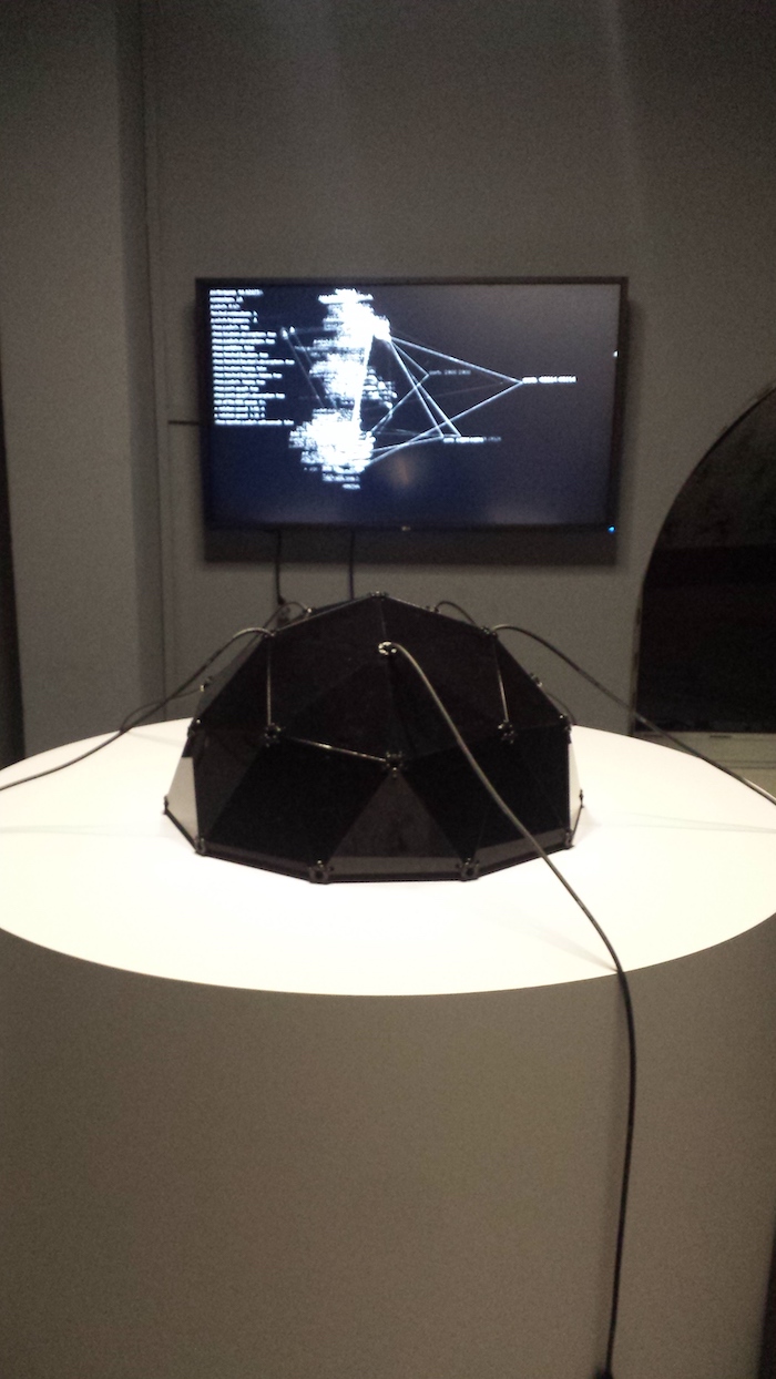 "Vibra v. 3" - a geodesic dome-shaped interactive object which uses bone conduction to sonify real-time data flow transmissions and brings an unusual experience of sound. Vibra v. 3 @ WRO Art Center A geodesic dome stands also for the form that can be read in the context of other ideas by Buckminster Fuller (who – by referring to Plato’s theory of forms – has worked out a mathematical formula to describes conversion of the sphere into the characteristic solid shape made of adjacent triangles); he viewed the Earth as a homeostatic entity traversing the space, and believed in the humanity’s survival and further existence on the inner equilibrium and capacity of its constitutive elements for mutual support. The geodesic dome is a unique material embodiment of a code-based thinking: it is a sensual (sensorially accessible only) programme for the matter which reminds that digitality – as derived from digitus, Latin for a finger – bespeaks also physicality, touch, scanning of the body parameters and self-knowledge. Vibra as an interactive installation went through several versions, from which two emerge as independent development paths: “Vibra v. 2” and “Vibra v. 3”, i.e. systems which use real-time Internet and satellite data as a building material for the creation of the generative sound structure. In addition, the installation titled simply "Vibra” – which uses bone conduction to distribute sound in a generative (but not using external data sources), 6-channel musical composition – was included in the Interactive Playground exhibition, and is both directed at the youngest audience and a well cognitive experiment: an attempt to reach to people who can not receive audio works for various reasons in the traditional way.
